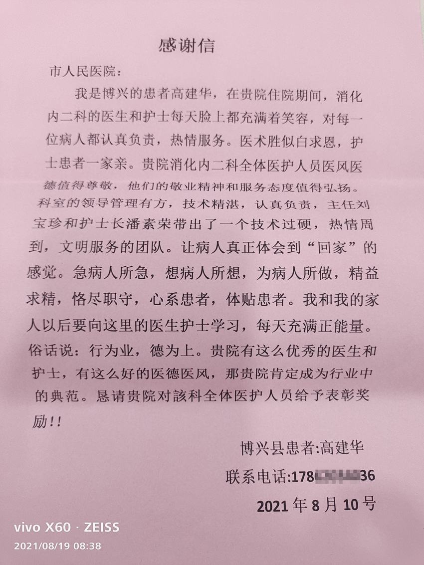 既是同一病房的病友也同时博兴老乡。住院期间,消化内科二病区精湛的医术、热心的服务让他们深受感动。三位老乡相约写下感谢信,表达感激之情。