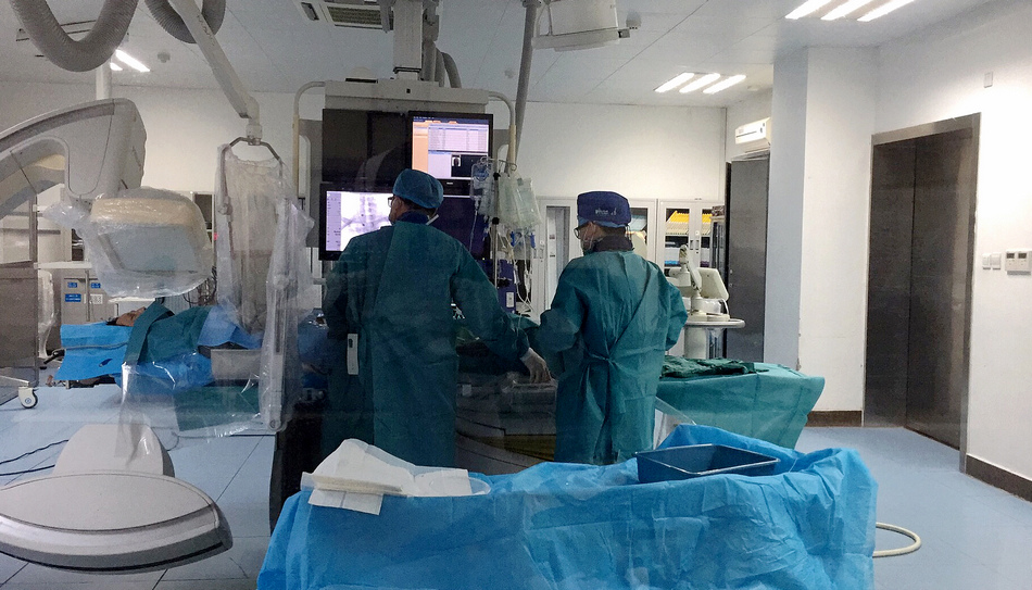 滨州市人民医院介入手术室,神经内二科主任、副主任医师王国卿、主治医师宋相孔正在紧张为患者做脑血管取栓手术。